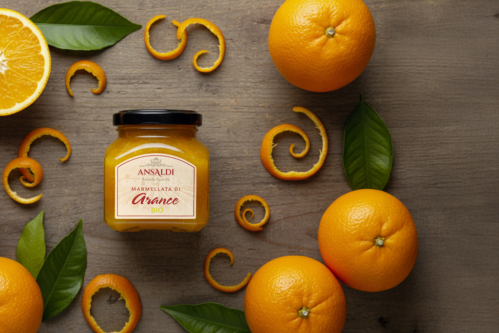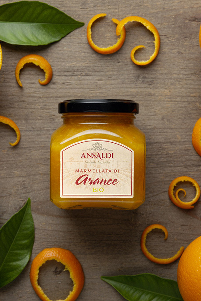 Marmellata biologica di arance prodotta direttamente presso il Baglio Donna Franca dai frutti della Tenuta Ansaldi. Vasetto da 210gr.