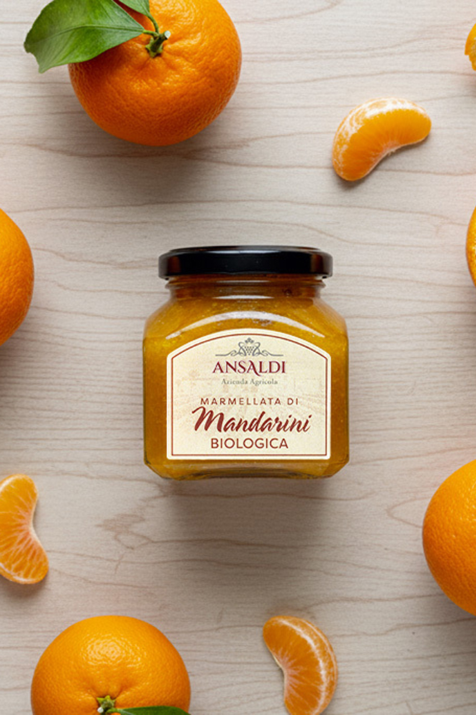 Marmellata biologica di mandarini prodotta presso il Baglio Donna Franca da mandarini della Tenuta Ansaldi. Vasetto da 210gr.